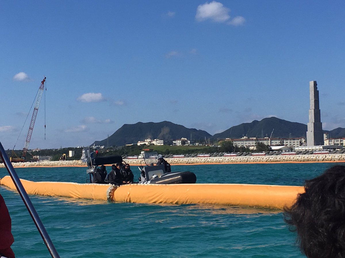 ダンプカーが岩ずりとは名ばかりの赤土をダンプアップして投下し、これをブルドーザーが海中に落とし込む。そしてこの作業をフロート内で海上保安庁の巡視艇が警備し、抗議の市民に退去を呼びかけ威圧する。まさしく米軍が沖縄の人々を追い払い、強制的に土地や家屋を接収し軍事基地を建設していった「銃剣とブルドーザー」の現代版に他ならないといえます。