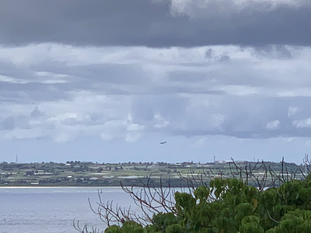 一方で海洋文化館を出て海を隔てて伊江島を眺めると、米軍機が旋回する光景が見えました。伊江島には伊江島補助飛行場という米軍基地があり、現在はF35Bの離発着訓練やパラシュート降下訓練などがおこなわれている他、過去には核兵器の模擬爆弾の投下訓練などもおこなわれました。